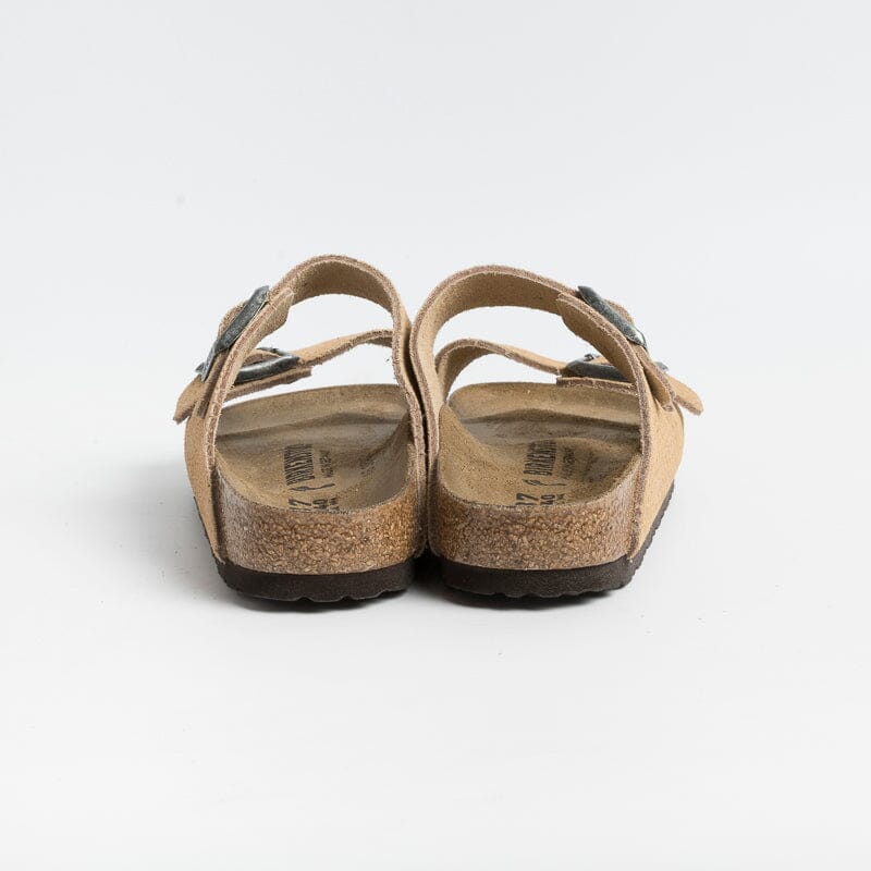Arizona sandal with double adjustable buckle, made of beige perforated suede. Anatomically shaped suede footbed. EVA sole.