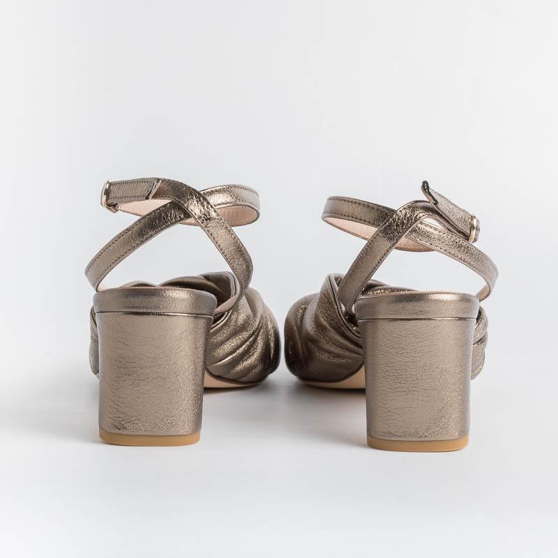 Morbidissimo sandalo a punta squadrata di Lorena Paggi realizzatO in pelle laminata di colore bronzo. Fascia arricciata sulla parte anteriore che avvolge il piede durante la calzata. Chiusura con cinturino alla caviglia. Sottopiede in pelle. Tacco chunky rivestito di circa 7 cm. Suola in cuoio con inserti in gomma .Calzata regolare.