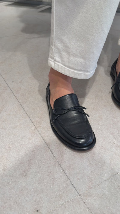 Mocassino di Pomme D'Or, realizzato in morbida pelle di colore blu navy con cucitura su mascherina e fiocchetto in pelle. Forma a punta stondata. Dotata di elastico sul retro per un'aderenza perfetta. Interno rivestito in pelle e comoda soletta interna, imbottita. Suola in cuoio con inserto in gomma.