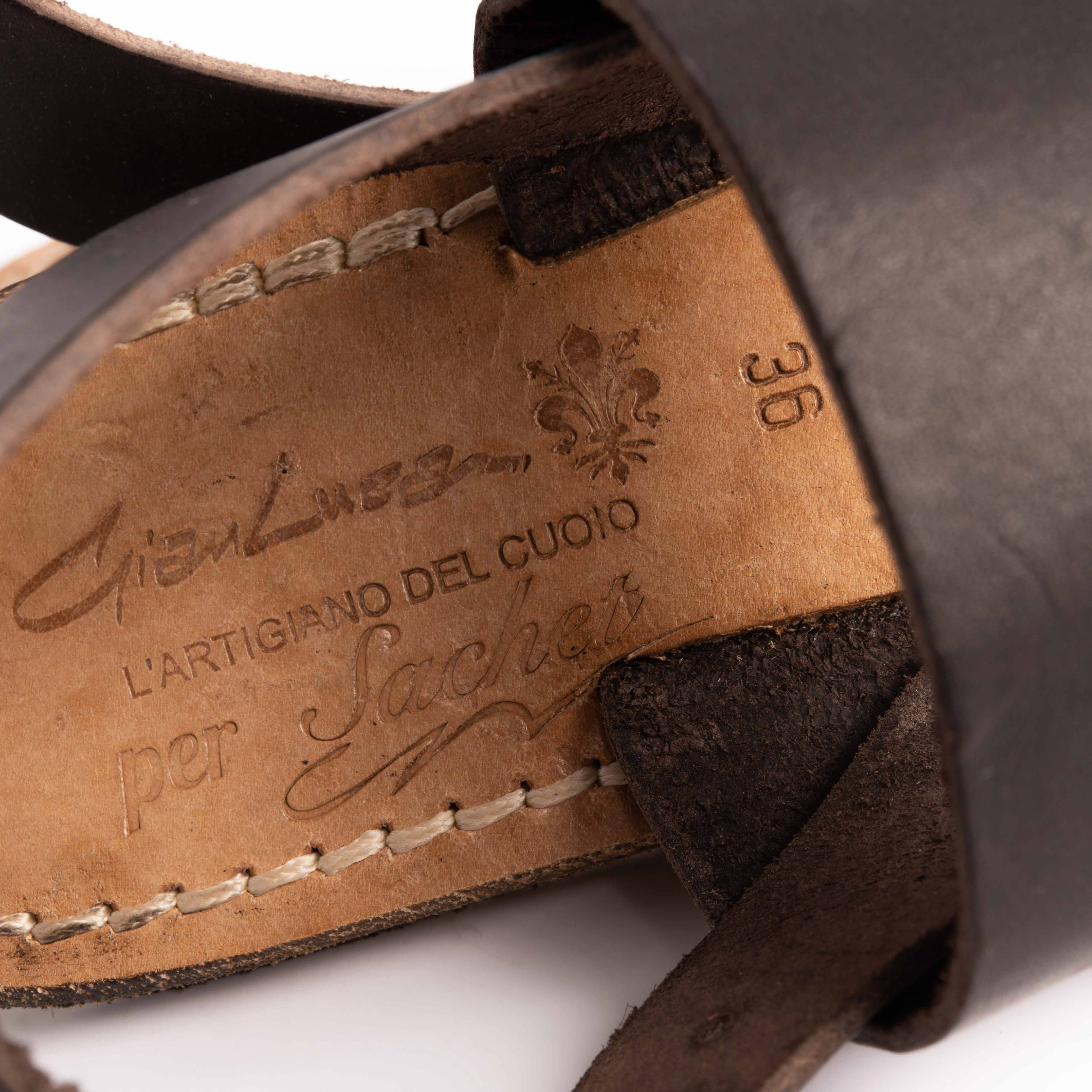 Sandalo francescano Sachet in morbida pelle di vitello, tomaia con doppia fascia color testa di moro, chiusura con cinturino regolabile alla caviglia. Suola e profili in cuoio fresati ed anticati per un effetto vintage.