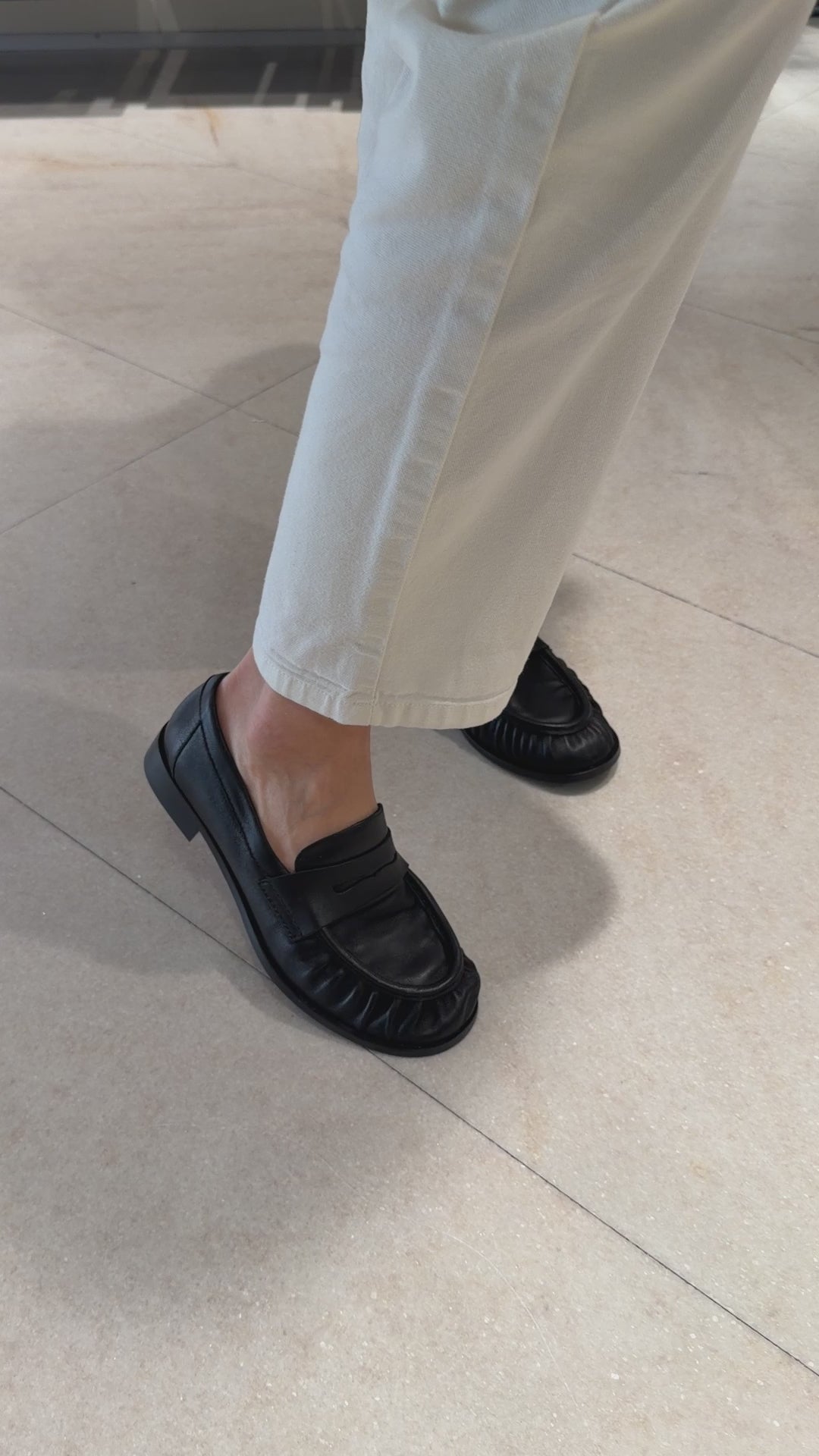 Morbidi mocassini di Strategia realizzati in pelle di colore nero con mascherina e cucitura arricciata su tomaia frontale. Interno e sottopiede foderati in pelle. Suola in cuoio con inserto in gomma.